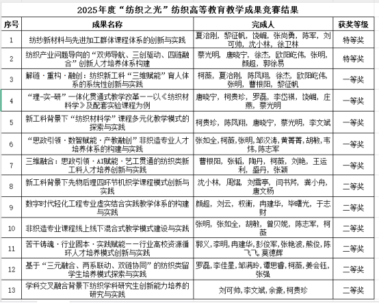 近日,2025年度“纺织之光”纺织高等教育教学成果竞赛结果公布,我院凭借在人才培养模式改革、课程体系创新、产教融合实践等方面的突出表现,共获得13项奖项,其中特等奖2项、一等奖5项、二等奖6项,本次获奖成果覆盖本科与研究生教育全链条,体现了“数智赋能、产教融合、特色引领”的鲜明特色。