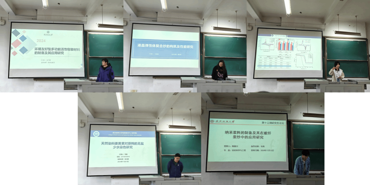 论坛上,张文雅、汪彬涵、李巍巍、刘磊、陈颖川五位同学依次介绍了自己的研究课题和目前取得的研究进展,并分享了自己的科研经验。主讲同学的研究课题包括环境友好型多功能活性包装材料、液晶弹性体复合纱、溶液喷射纺蒲草基相变PAN纤维、天然染料姜黄素、纳米浆料,契合了“纺织新材料及绿色加工”主题,代表了免费足球直播