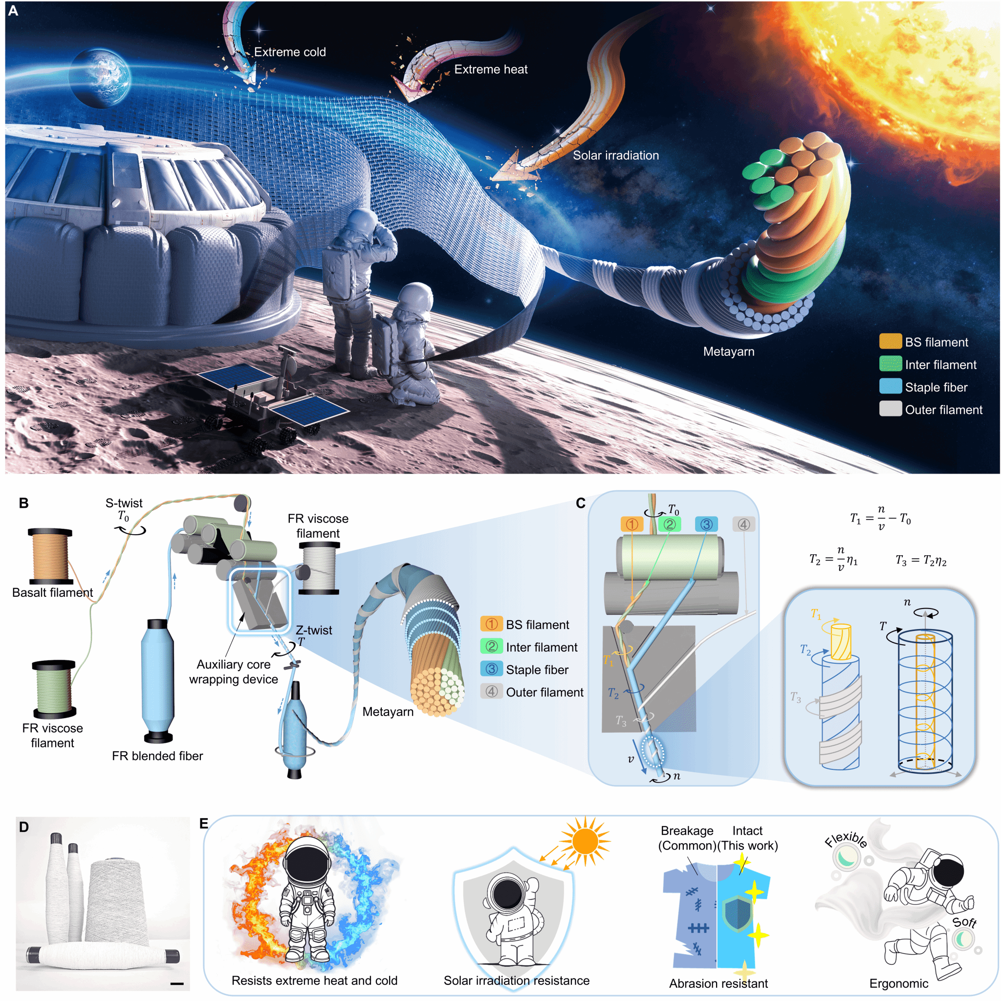 近日,纺织新材料与先进加工全国重点实验室徐卫林院士团队夏治刚教授课题组联合陶光明教授(国家杰青),在Matter期刊发表题为“Hierarchical basalt metayarn for ergonomic protective space textiles”的研究论文(论文连接://doi.org/10.1016/j.matt.2025.102481)。该纺纱新材料与先进加工课题组首次提出了卷芯纺纱技术“coaxial spiral wrap spinning”,解决了玄武岩纤维在超细尺度下无损、低扭、高品质、批量化纺纱、织造、服用难题,为高刚高脆无机纤维材料的大规模亲肤柔韧型纺织加工开辟了新途径,可批量化满足航空航天领域对高性能防护材料抵御复杂极端环境的迫切需求。论文第一作者为夏治刚教授,通讯作者为徐卫林院士、陶光明教授(国家杰青)。