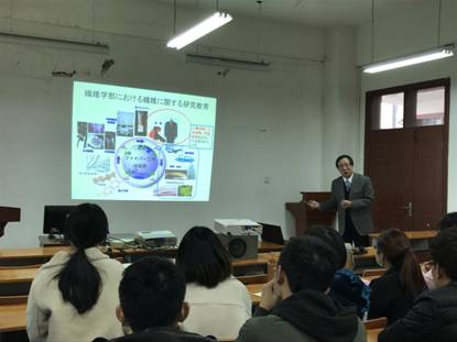 鲍教授首先对信州大学地理位置、学校发展历程做了简单介绍,并强调与武汉纺织大学是友好学校关系,与我校共同研究、友好协定、资源共享。语言诙谐,内容丰富。