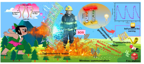 高温火场环境中对消防服装所承受温度的实时、精准监测,避免防护服装高温热损伤,确保消防员操作安全意义重大。自供电柔性火灾预警材料的设计制备是消防服用可穿戴电子设备领域的热点研究方向之一。其中,热电纤维具有大长径比,可三维弯曲覆盖人体表面,透气透湿,可洗涤和温度感知等优点成为首先材料。然而,受限于金属电极连接p型与n型热电纤维或热电粒子与绝缘纺丝液的混合,导致其表现出大接触电阻和低输出性能,从而降低了在实际火灾预警应用中的精准温度感知能力。