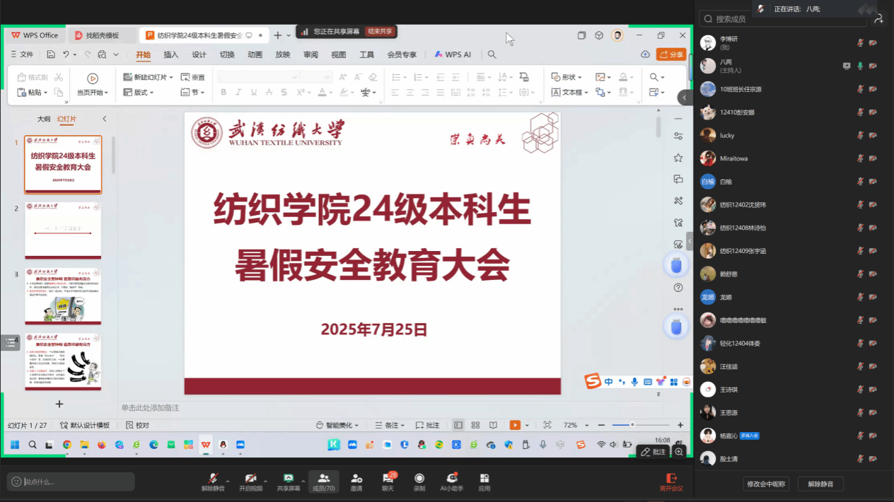班会上,各年级辅导员结合近期发生的安全事故案例,通过视频展示、图文讲解、互动问答等形式,向同学们详细讲解了暑期可能面临的各类安全隐患及防范措施,内容涵盖社会实践安全、防溺水、防诈骗、消防安全、心理健康、交通安全、食品安全等多个方面。