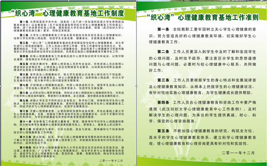 党政领导班子和全院师生的共同建设下,大学生心理健康教育基地的设施逐步完善,心理健康教育队伍逐渐扩大,心理健康教育内容日益丰富。同学们通过与我院老师面对面交流、电话交流等多形式交流自身在平时学习和生活中遇到的困扰,通过导师、辅导员和班主任及时的沟通和指导,学生获益良多。“织心湾”已俨然成为大学生的良师益友。