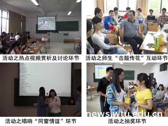 本次活动还通过“击鼓传花”等师生互动游戏让每个同学都真正参与进来,使大家敞开心扉,诉说自己对“人际关系”、“情感”等热点问题的看法,以及自己将会采取什么办法解决这些困扰并如何帮助他人走出心理阴影。最后通过集体讨论,让同学们进一步明确了在今后的日常学习生活中,遇到类似问题时如何真正做到“自助—助人—互助”。