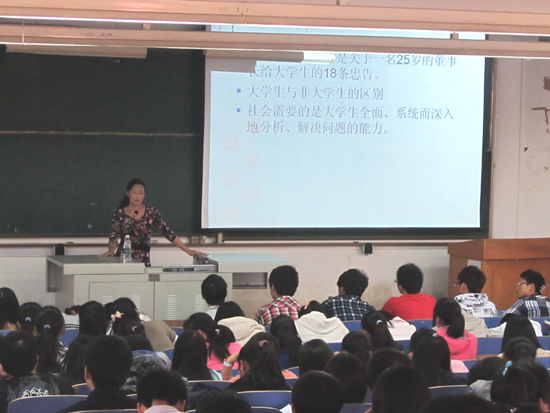 张书记首先谈到大学新生几种常见的心理适应不良的症状,并用列举实例、播放视频短片的形式,加深印象、引发同学们思考,从“生活与学习环境”、“大学教学模式”、“理想与现实的落差”、“人际关系”、“目标缺失”等五个方面分析其原因。接着,她以丰富的理论知识及多年学生工作经历,运用诙谐生动的语言,从“树立新的学习目标”、“重新规划学业”、“学会独立生活”、“学会自主学习”、“以宽容的心态接纳结交朋友”等方面阐述对心理适应不良症状的调试方法,为新生“如何读大学”指明了方向。