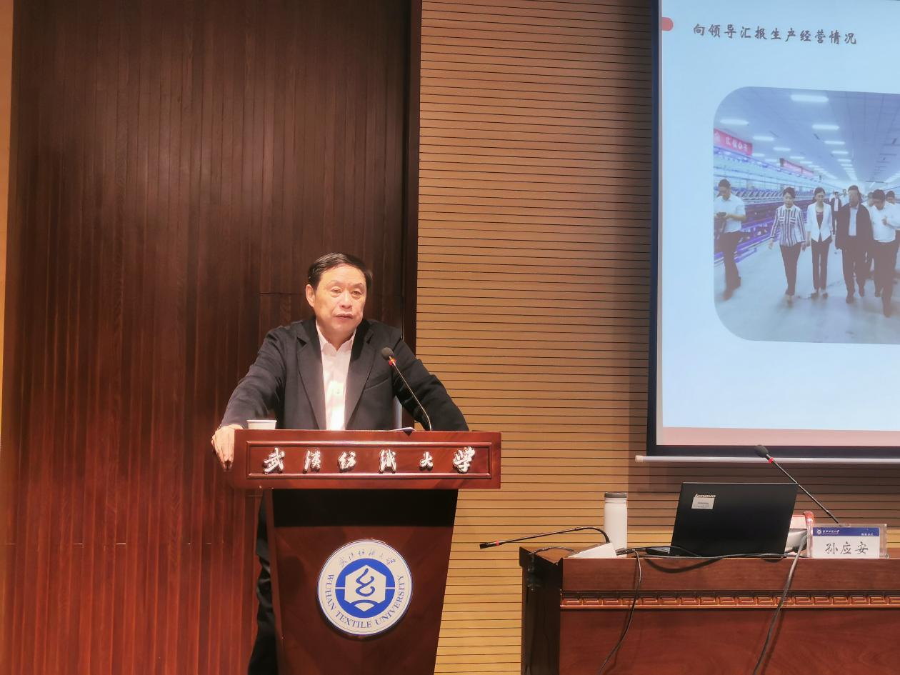 孙应安回忆起自己在武汉纺织大学的求学生涯,感慨到学校发展迅速、科技学术成果丰硕,并向同学们分享自己从事纺织行业四十余年的职业经历,引导同学们树立专业自信心、立好专业报国志。孙应安向同学们详细讲解了湖北孝棉实业集团有限责任公司的发展历程与行业地位,着重与同学们分享了企业响应国家一带一路政策号召,积极实行产业援疆企业改革的故事,展现纺织企业家以人民为中心、以党和国家需要为根本的家国情怀。随后他表示纺织行业是民生行业,是经济支柱产业,更是出口创汇行业,具有强大的生命力与坚韧性,未来发展建设大有可为。