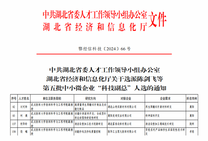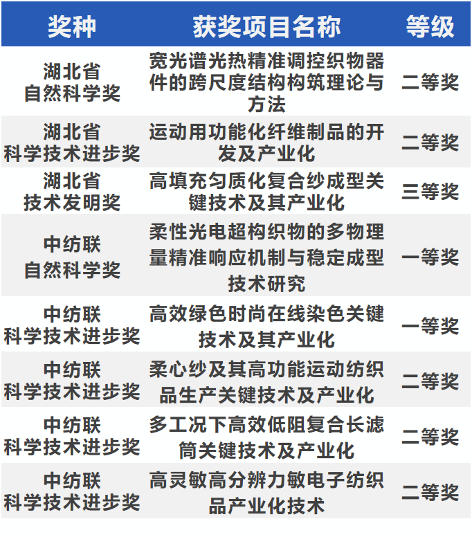 3.获批省部级科技奖8项,科技成果再创新业绩。获批湖北省科技奖3项,中国纺织工业联合会科技奖励5项(一等奖2项、二等奖3项)。全年发表发表高水平学术论文200余篇,其中SCI一区论文59篇。授权发明专利近50项。