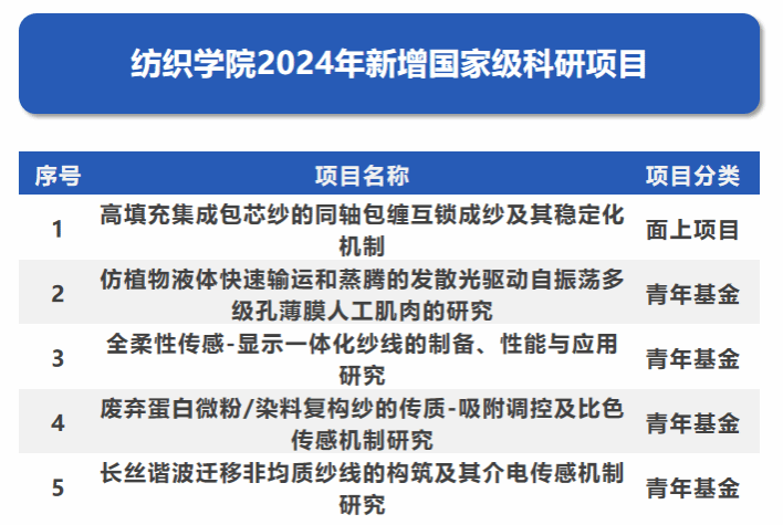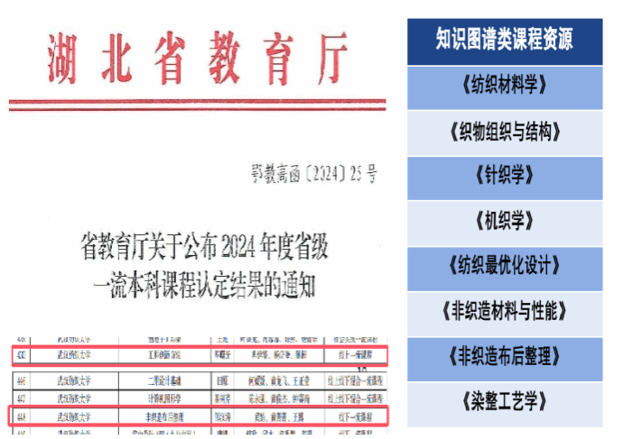 5.获批省级一流课程2门,出版“十四五”部委级规划教材2本,课程建设喜结新硕果。《工程创新方法》《非织造布后整理》获批省级一流课程,获批省级“新工科”建设项目3项,出版“十四五”部委级规划教材《现代纺织颜色科学》《机织产品设计原理与实例》,完成系列知识图谱+AI技术赋能优质课程资源。