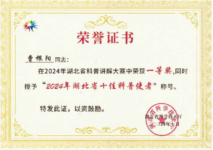6.获批湖北省百人计划,师资队伍建设再获新突破。获批2024年湖北省产业教授2人、黄鹤英才4人,获评“湖北省十佳科普使者”荣誉1人,获聘科技副总4人、院士专家行3人、博士服务团1人。
