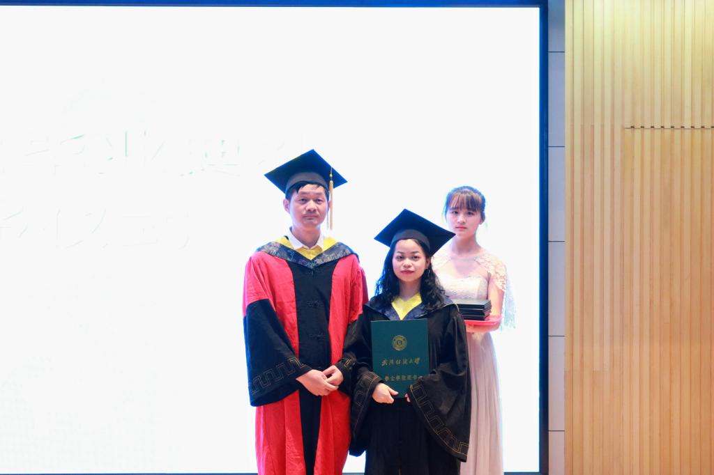2019届本科生学位授予仪式开始。本次学位授予仪式由蔡光明教授主持,纺织工程系系主任曹新旺老师为2019届毕业生颁发学位证书,张尚勇院长为学士学位获得者拨穗,正冠。