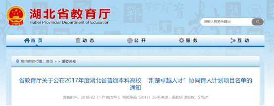 “荆楚卓越人才”协同育人计划项目旨在适应国家战略需求和满足区域经济社会发展需要,围绕人才培养规格与经济社会发展需要紧密对接的目标,改革人才培养模式,推动高校与行业企业、科研院所、实务部门建立战略联盟,形成科教结合、产教融合、校企合作协同育人的长效机制,为打造湖北经济升级版提供人才保障。