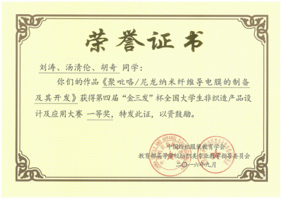 据悉,此次大赛共收到来自东华大学、苏州大学等13所高校的103份参赛作品,成果涵盖科学技术成果、发明创造、专利技术和文学作品等多个方面,大赛邀请了中国纺织服装教育学会倪阳生会长、中国纺织工业联合会副会长兼中国产业用纺织品行业协会会长李陵申、教指委非织造材料与工程专业分委会主任钱晓明教授、浙江金三发集团董事长严华荣以及来自武汉纺织大学等单位的非织造材料专家和行业领军人物担任评审专家组织评审。由我院韦炜老师指导的学生团队的参赛作品《聚吡咯/尼龙纳米纤维导电膜的制备及其开发》因体现了非织造专业知识与其他领域知识、技术的深度“融合”,展现了非织造生产工艺、产品应用领等方面所反映的“创新”,充分契合大赛主题“融合与创新”而荣获一等奖。