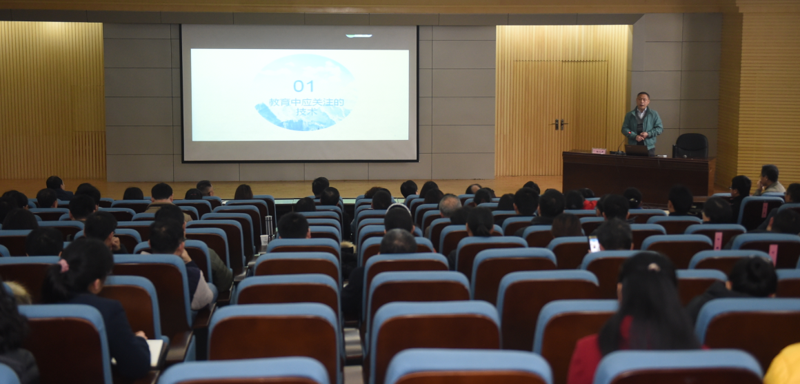 杨九民教授的报告从教育应关注的技术、信息化环境下的教学实践、教育信息化探索中的研究前沿等三个方面展开。杨教授从地平线报告中教育行业应该关注的技术入手,向老师们展示了信息化的发展历程,信息技术给教育带来的改变。针对传统课堂存在的四大问题,杨教授结合丰富的案例阐述了混合式课堂模式下的教学设计。他提出,在信息化背景下提高教育质量,关键是推动信息技术与教育教学深度融合,着力推进教师教学能力创新、教学内容创新、教学方法创新、教学评价创新。