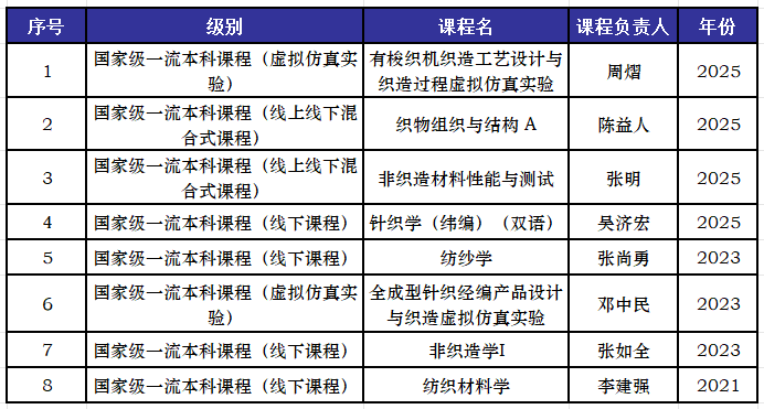 近日,教育部高等教育司公示了第三批国家级一流本科课程认定结果。我院申报的《有梭织机织造工艺设计与织造过程虚拟仿真实验》、《织物组织与结构 A》、《非织造材料性能与测试》、《针织学(纬编)(双语)》四门课程获批国家一流本科课程。