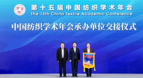 主会场最后进行了中国纺织学术年会承办单位的交接仪式。伏广伟理事长从第十五届中国纺织学术年会承办单位南通大学副校长华亮手中接过年会旗,转交给第十六届中国纺织学术年会承办单位武汉纺织大学副校长冯军手中,2026年第十六届中国纺织学术年会将在我校举办,期待明年再会。