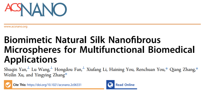 该工作以“Biomimetic Natural Silk Nanofibrous Microspheres for Multifunctional Biomedical Applications”为题发表在《ACS Nano》上,通讯作者为武汉纺织大学尤仁传教授(校特聘教授)、张强教授和清华大学张莹莹教授。