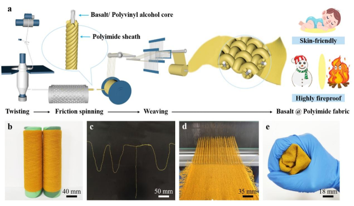 火灾严重造成人员伤亡和财产损失。为保护消防员的生命安全,近日武汉纺织大学先进纤维及其集合体加工技术课题组,发明了一项适用于脆性纤维材料成纱的无损包覆纺纱技术,并携手华中科技大学、湖北汇尔杰新材料股份有限公司、际华三五四二纺织有限公司、际华三五零二职业装有限公司,采用聚酰亚胺(简称PI)纤维无损包覆脆性玄武岩(简称BS)纤维材料纺纱,成功将脆性无机玄武岩纤维进行有机化的无损全裹覆,开发出无机/有机纤维复合的核壳结构BS@PI纱,小批量制备出高绝热的耐火、防火面料,从而解决了“无机纤维高耐热但易脆断、刺激皮肤;有机纤维柔软高强、对皮肤友好,但耐热性差”的矛盾性难题,为无机玄武岩纤维在消防服、防溅服、电焊服等商业化应用,提供了一条高效的商业化制备技术路线。