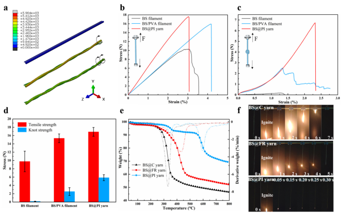 文中相关的系列实验结果及其分析显示:对比其他样品,BS@PI纱线具有优异的力学性能(图2a-d),其拉伸强力为16.88±1.06 N,打结强力(5.86±0.73N)比BS长丝(0.16±0.04 N)高36.63倍;热稳定性能好(图2e),在800 ℃时的残炭量为69.34 %;极强的阻燃性能(图2f),被点燃后0.3秒自熄。所开发的BS@PI织物具有皮肤友好性、高于国家标准的防火性能,耐温高达1142℃、热防护值(TPP值)高达33.71 cal/cm2。