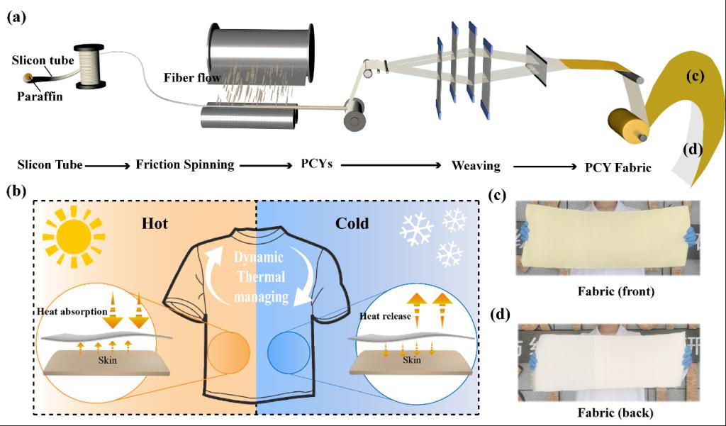 热管理和超高防护纺织品对极地科学家、宇航员和消防员至关重要。然而,大规模制造耐用热管理、超高热防护的包芯纱线仍是一个挑战。近期,武汉纺织大学徐卫林院士团队的夏治刚教授课题组,携手华中科技大学苏彬教授,创新提出液流纺制备一种基于石蜡的包芯纱(图1),实现了热管理纱线的批量化生产,用于极端温度和热防护。