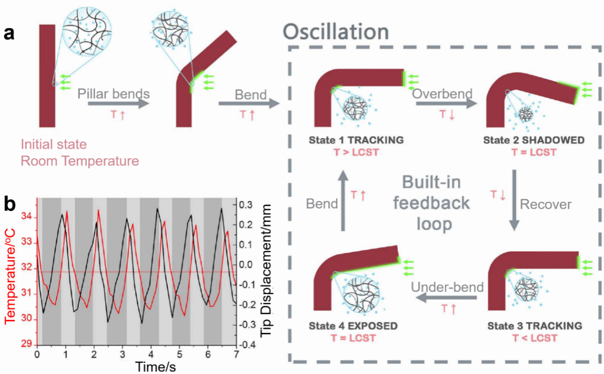 激光或光束可以精确控制致动器的照明区域和致动方向。激光响应致动器在激光照射下由于不对称体积变化发生弯曲,使致动器远离激光源和致动器冷却、体积迅速恢复来实现自振荡。例如,He等人开发了一种基于金纳米粒子-PNIPAm水凝胶的激光驱动自振荡致动器(图2a)。PNIPAm是一类热敏水凝胶,它可以在分别低于或高于临界溶解温度(LCST)的环境温度下产生体积溶胀和收缩。金纳米粒子可以将吸收的光能转化成局部热能,使水凝胶柱产生温度梯度,产生不对称,并向下弯曲。当水凝胶与光线平行时,凝胶局部冷却,体积溶胀,向上弯曲。基于光自遮蔽效应诱导的负反馈和交替温度变化(图2b),该致动器可实现自主振荡运动。
