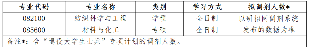 ①一志愿报考纺织科学与工程、材料与化工、材料、化学、服装设计与工程、生物工程、生物医学工程、机械、计算机等相关专业均可调剂。