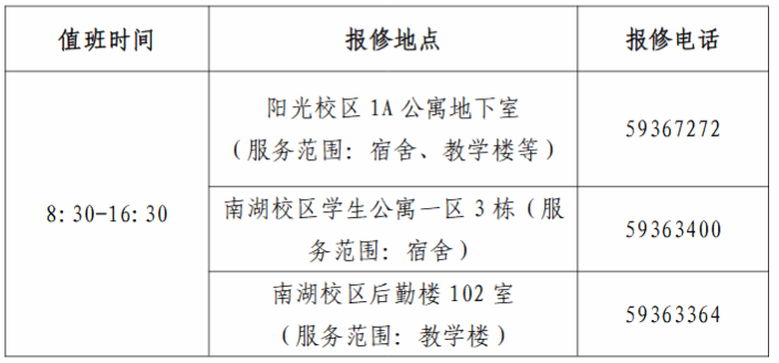 (二)水电维修安排假期校园所有路灯实行间隔关停,并控制开关灯时间。保留理工楼、实训楼泵房,其他所有教学楼泵房1月19日开始降压并逐步关闭。水电报修以企业微信平台为主。