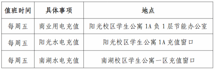 (四)校园卡充值服务:请各位师生将校园卡提前备足假期可用的消费额度。校园卡里余额不足的,可使用企业微信充值。为满足部分师生的需求,现金充值安排如下: