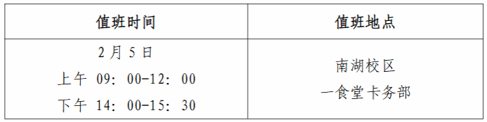 (一)南湖校区食堂:南湖教工食堂为假期值班食堂,保障每日早、中、晚餐三餐供应。南湖学生临时食堂保障窗口供餐至1月19日晚餐。