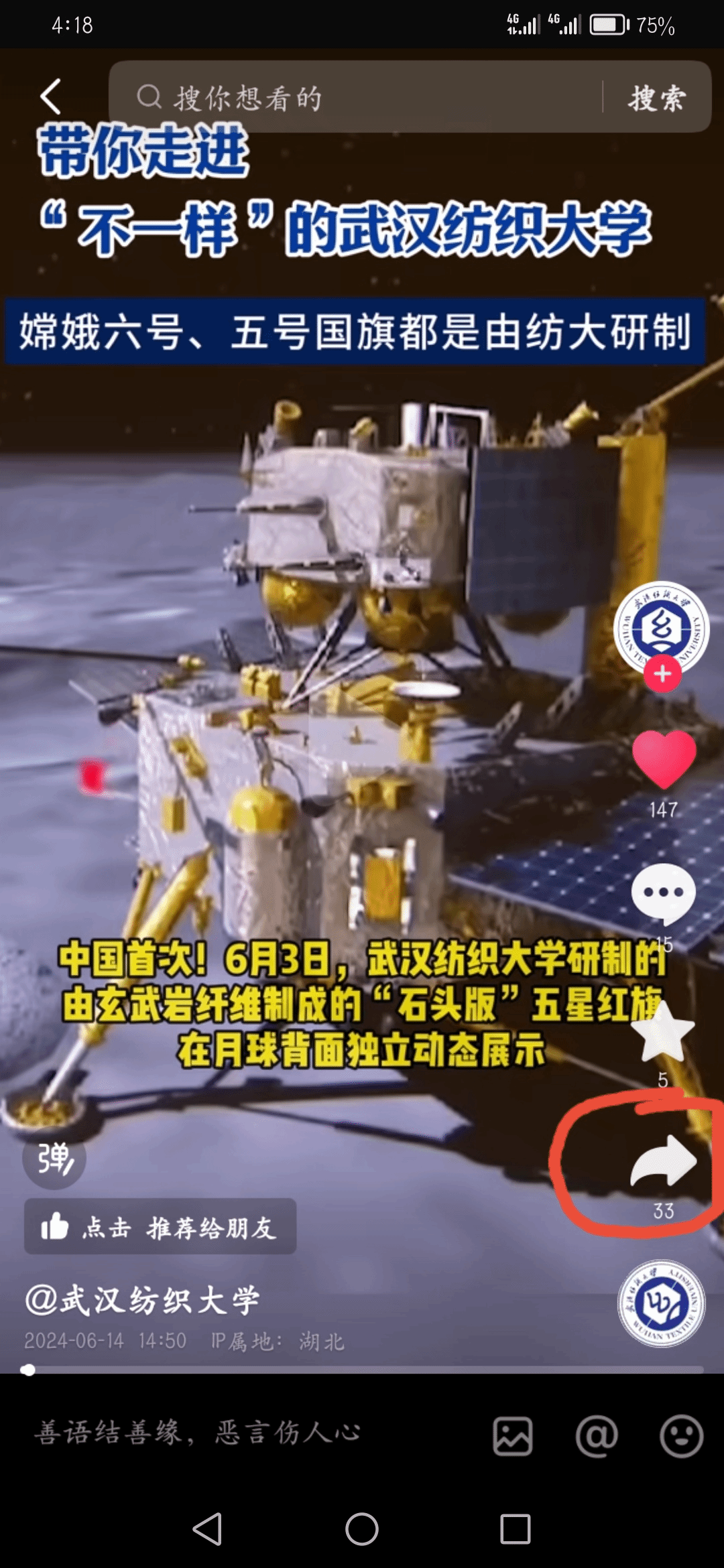 为配合做好2024招生宣传,宣传部围绕学校研制的嫦娥六号月面国旗,制作了《带你走进“不一样”的武汉纺织大学》招生短视频,并在学校官方视频号、抖音号、B站等平台进行了推送,为了进一步扩大宣传效果,请师生在抖音平台点赞、推荐。