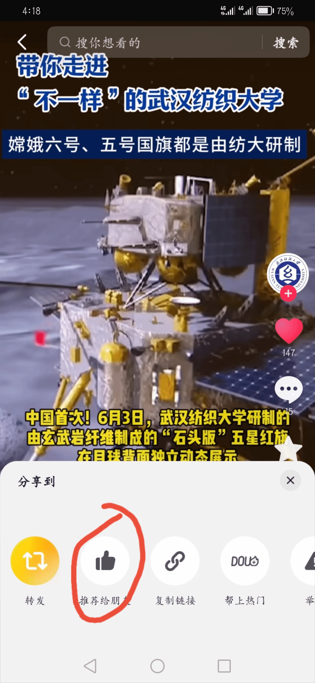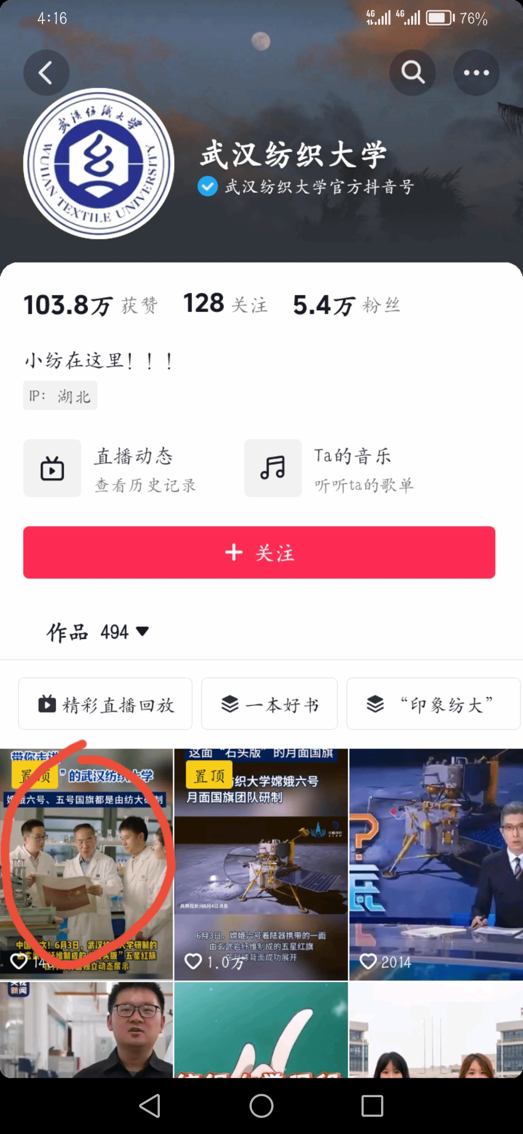 步骤一:打开武汉纺织大学官方抖音号,点开该视频