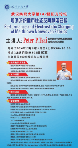 田纳西大学的退休及兼任教授Peter P. Tsai应邀于2024年12月18日上午做客我院,为我院师生作线下学术报告,学术报告题目为:“熔喷非织造布性能及其静电驻极”。学术报告由刘延波教授主持,刘延波教授和免费足球直播