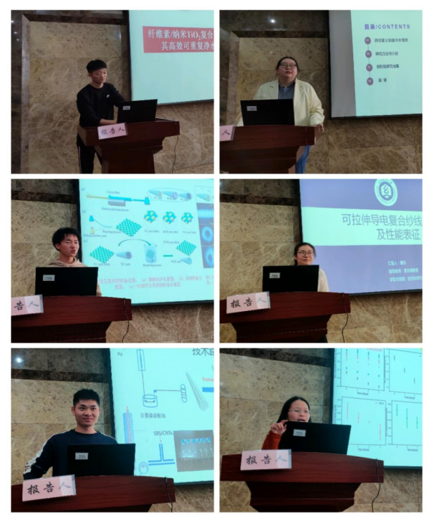 论坛上,洪焱、刘宛瑾、王凯、曾珍、夏咏和杨慧六位同学分别介绍了自己的研究课题和目前取得的研究进展,并分享了自己的科研经验。主讲同学的研究课题涵盖了纤维素/纳米TiO2复合粉体、超吸附麻纤维、高回弹棉基纱线、可拉伸导电复合纱线、柔性纤维应变传感器、冠状动脉支架等方面,代表了免费足球直播