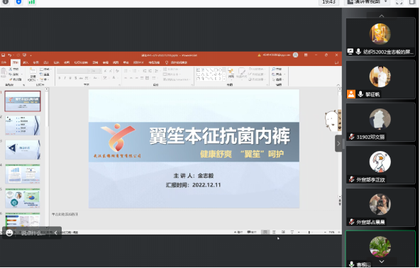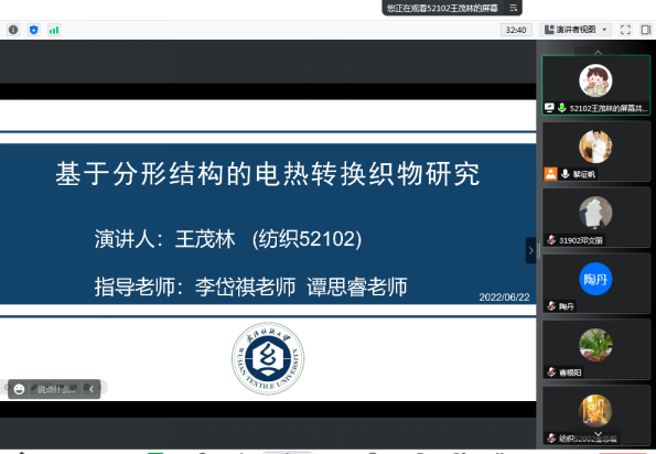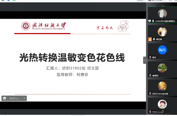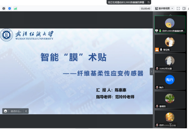 4位本科生交流了课外科技成果 。纺织12001班陈惠惠汇报了纤维基柔性应变传感器的制备及其性能研究,项目获得“互联网加”大学生创新创业大赛湖北省金奖。纺织31902班邓文丽汇报了光热转换温敏变色花色线的研发,项目获得“前进杯” 中国高校牛仔面料设计大赛全国特等奖和“新澳杯”大学生纱线设计大赛全国一等奖。纺织52102班王茂林汇报了基于分形结构的电热转换织物的研究,项目获得“溢达杯”大学生创意大赛校一等奖。纺织52001班金志毅汇报了本征抗菌面料的开发及在内衣上的应用,项目获得“挑战杯”大学生创业计划大赛校铜奖。