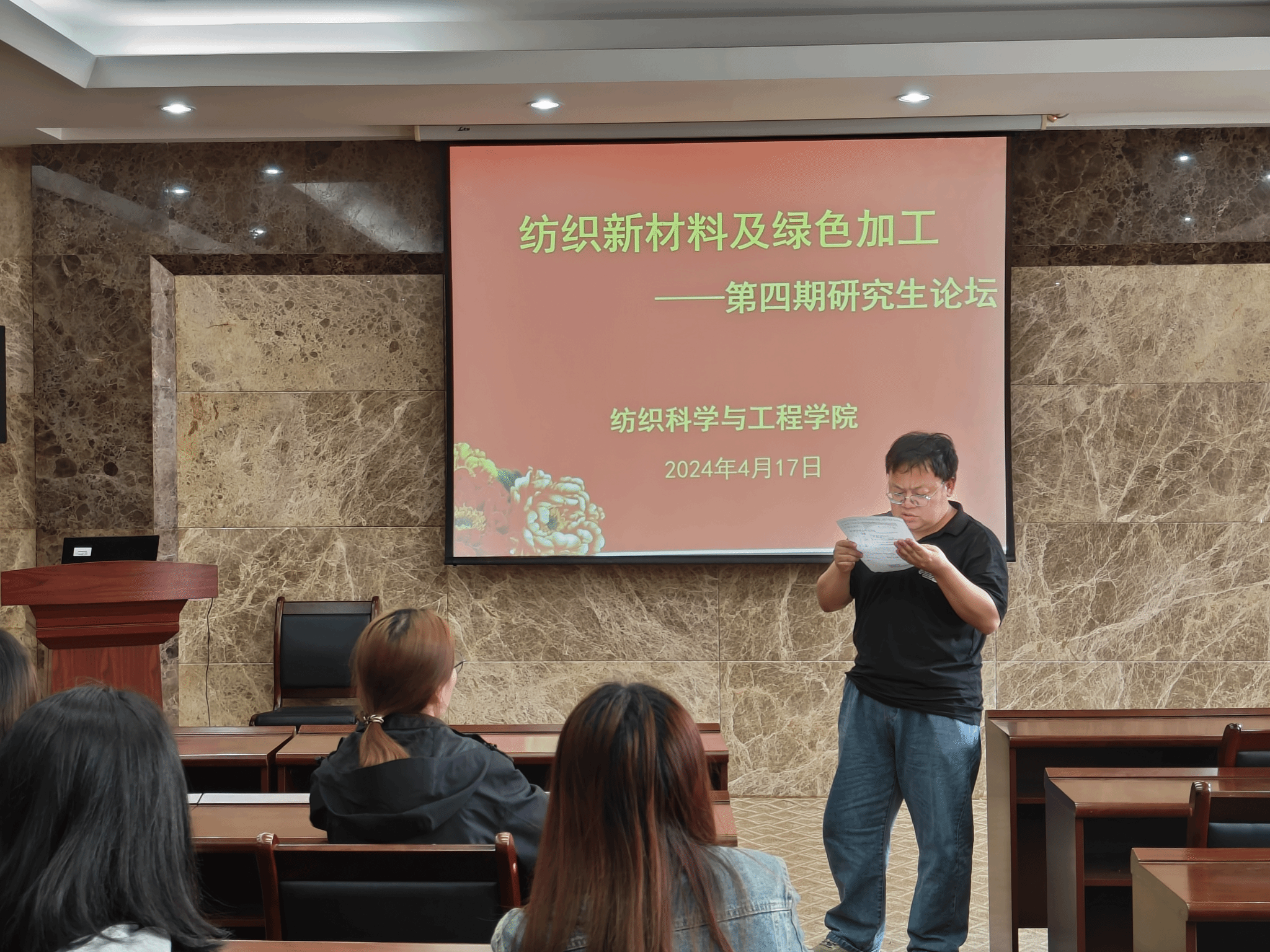 首先,王晓晓老师介绍了举办研究生论坛的主旨和意义,同时宣布第四期“纺织新材料及绿色加工”研究生论坛开始。