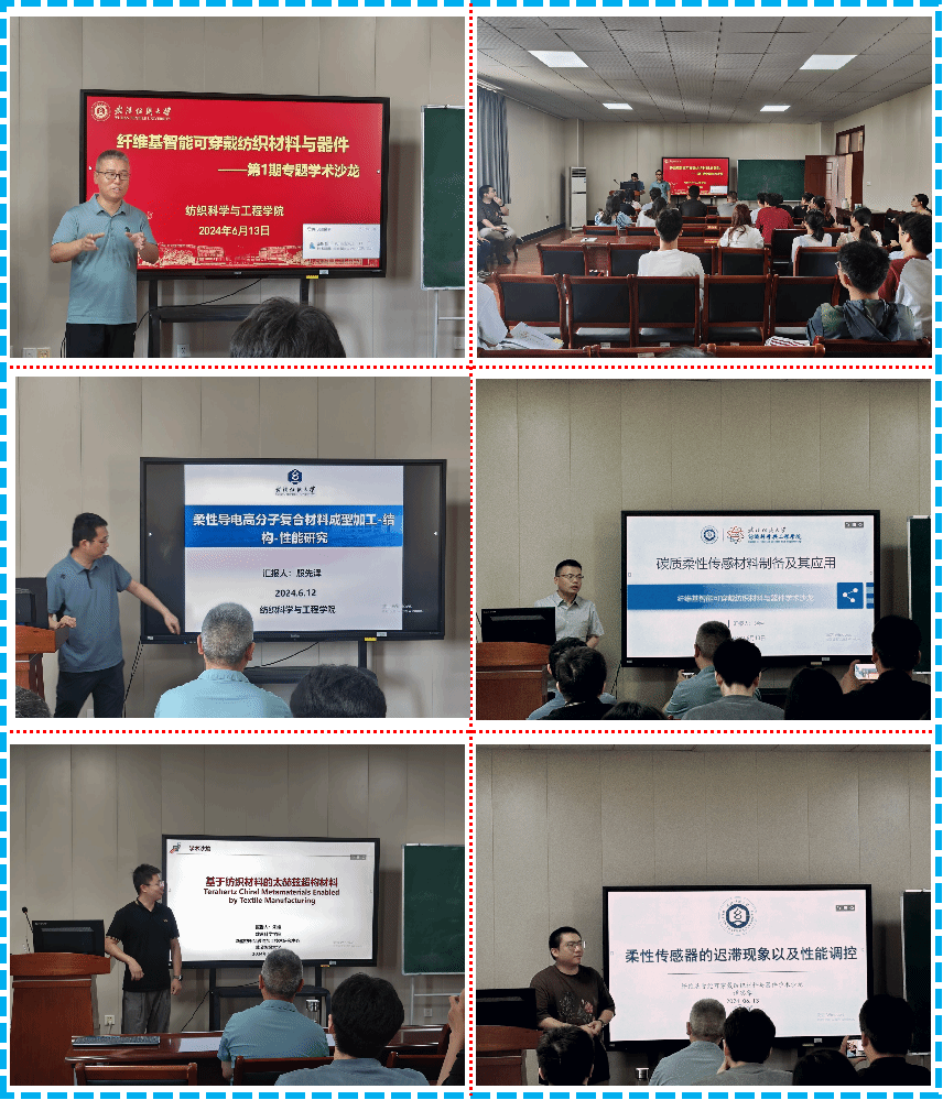本次学术沙龙活动中,殷先泽、赵仲、朱维、谭思睿共4位老师依次作为主讲人分别以“柔性导电高分子复合材料成型加工-结构-性能研究”、“碳质柔性传感材料制备及其应用”、“基于纺织材料的太赫兹超构材料”、“柔性传感器的迟滞现象与性能调控”为题作了报告,主讲内容涵盖了纤维基智能建筑材料、智能可穿戴纺织品、纤维物理特性检测技术等领域,契合了“纤维基智能可穿戴纺织材料与器件”主题,并和在场师生围绕报告技术方案、关键科学问题、创新性研究方向、基金项目申请、技术与项目合作、成果转化等方面展开了深入的探讨,现场气氛热烈。