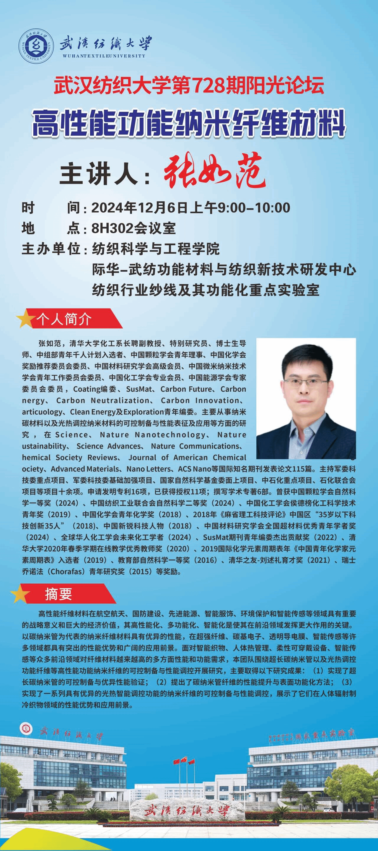 清华大学化工系张如范研究员应邀于2024年12月6日上午做客我院,为我院师生作线下学术报告,学术报告题目为:“高性能功能纳米纤维材料与光热调控材料”。学术报告由院长夏治刚教授主持,夏治刚教授和免费足球直播