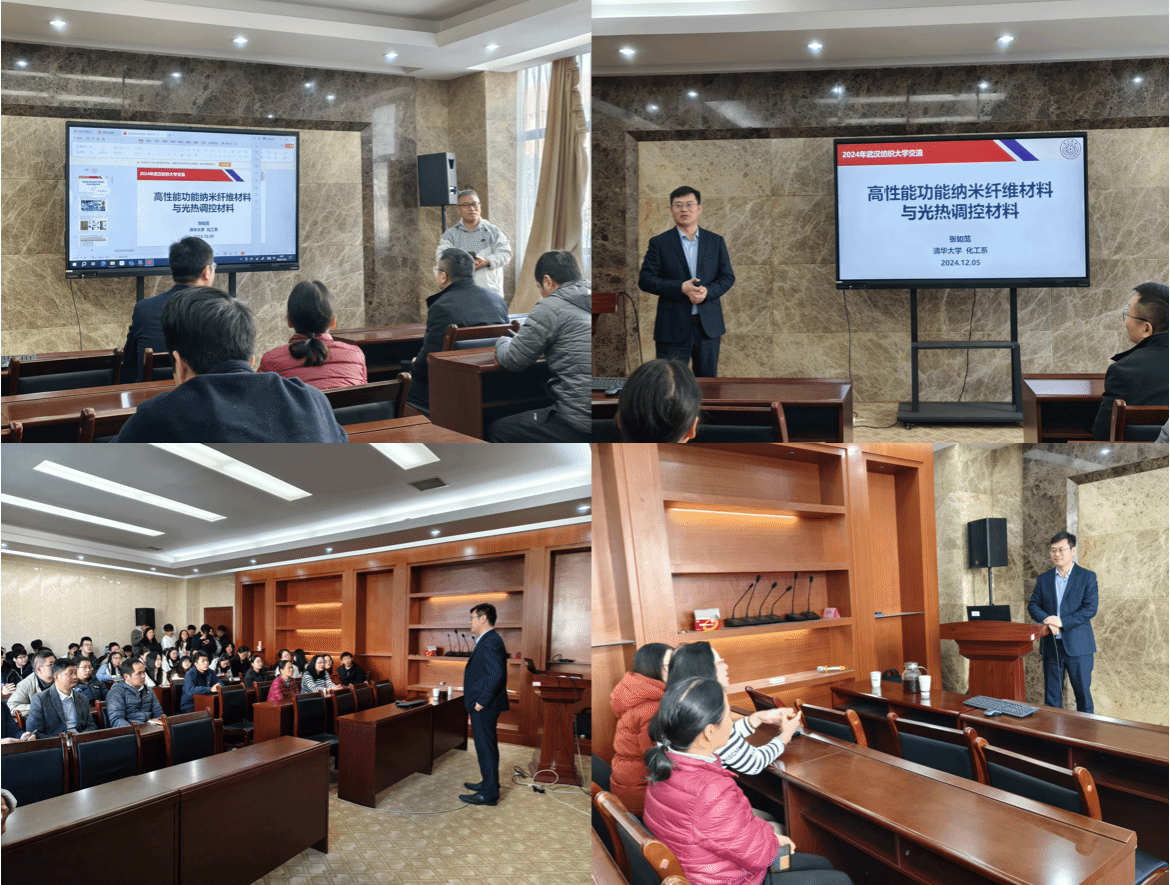 夏治刚教授首先介绍了张如范研究员的科研、工作经历,并对张如范研究员的出席表示了热烈欢迎。讲座中,张如范研究员以“高性能功能纳米纤维材料与光热调控材料”为题介绍了该课题的研究背景,并分享了如何高性能纤维材料在航空航天、国防建设、先进能源、智能服饰、环境保护和智能传感等领域具有重要的战略意义和巨大的经济价值,其高性能化、多功能化、智能化是使其在前沿领域发挥更大作用的关键。以碳纳米管为代表的纳米纤维材料具有优异的性能,在超强纤维、碳基电子、透明导电膜、智能传感等许多领域都具有突出的性能优势和广阔的应用前景。面对智能织物、人体热管理、柔性可穿戴设备、智能传感等众多前沿领域对纤维材料越来越高的多方面性能和功能需求,本团队围绕超长碳纳米管以及光热调控功能纤维等高性能功能纳米纤维的可控制备与性能调控开展研究,主要取得以下研究成果:(1)实现了超长碳纳米管的可控制备与优异性能验证;(2)提出了碳纳米管纤维的性能提升与表面功能化方法;(3)实现了一系列具有优异的光热智能调控功能的纳米纤维的可控制备与性能调控,展示了它们在人体辐射制冷织物领域的性能优势和应用前景。张如范研究员和参会的师生就高性能功能纳米纤维材料与光热调控材料进行了热烈的交流,为师生们答疑解惑,参会教生表示讲座内容干货满满、收获满满。最后,参会师生对张如范研究员表示了诚挚感谢。