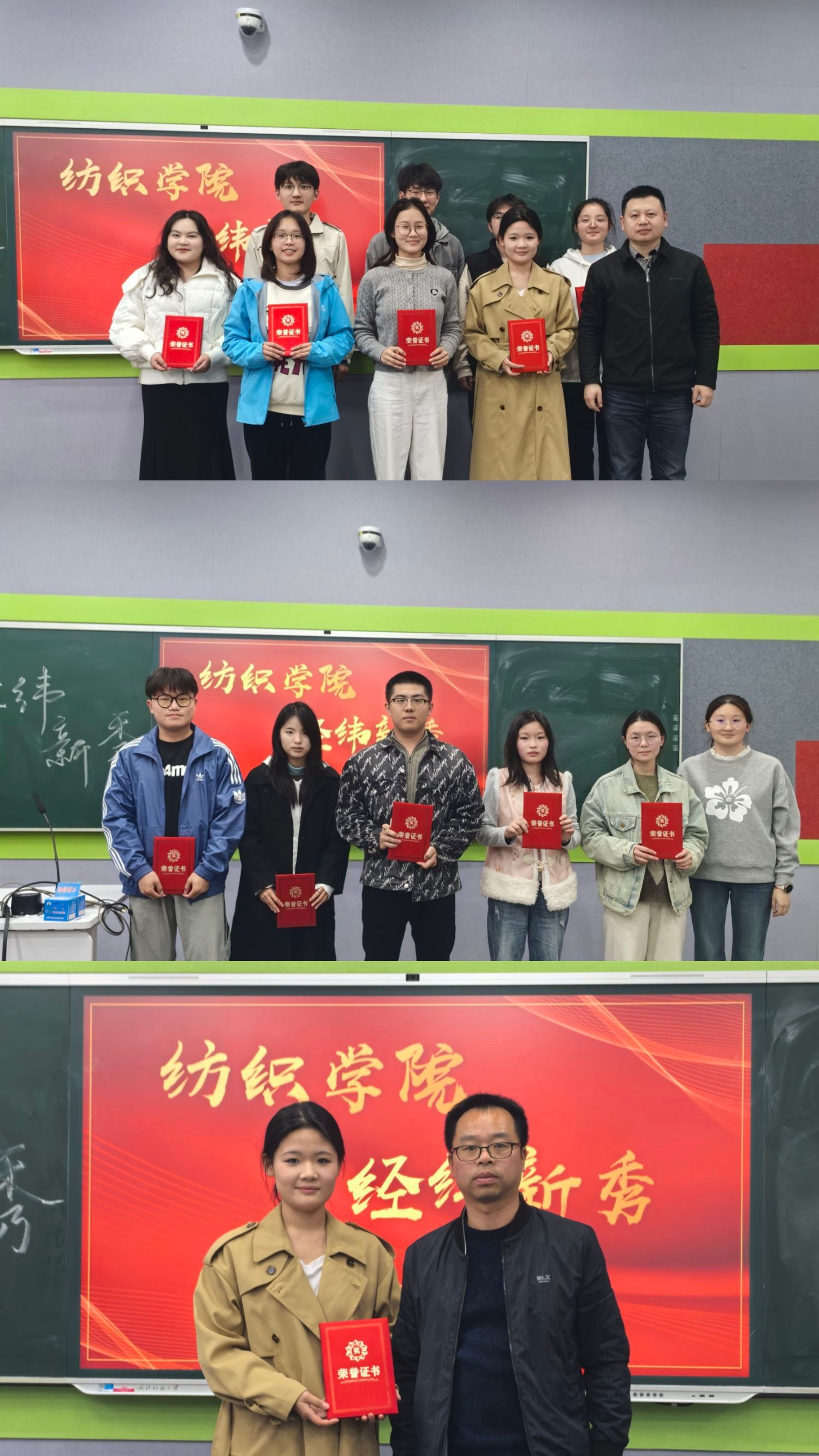育人理念的实践成果,既有智育排名蝉联年级第一的‘学术标杆’,也有手握10余项国家级省级竞赛大奖的‘科研先锋’,更有累计志愿服务超400小时的‘公益之星’,生动诠释了新时代纺织人的全面发展理念,彰显了新时代纺织学子的创新担当。”