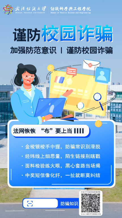 精心筹备,学生参与设计。本次活动的宣传单由免费足球直播 大一本科生高小源设计制作,充分体现了龚全珍同志倡导的“自力更生、艰苦奋斗”精神。宣传内容结合当前高发的刷单诈骗、冒充客服、虚假贷款等典型案例,以纺织特色顺口溜的形式呈现诈骗手法和防范要点,生动易懂。免费足球直播 学生工作负责人赵亮老师表示:“学生自主参与宣传设计,既是对龚全珍同志‘教育要面向群众’理念的践行,也能增强反诈宣传的亲和力和传播效果。”