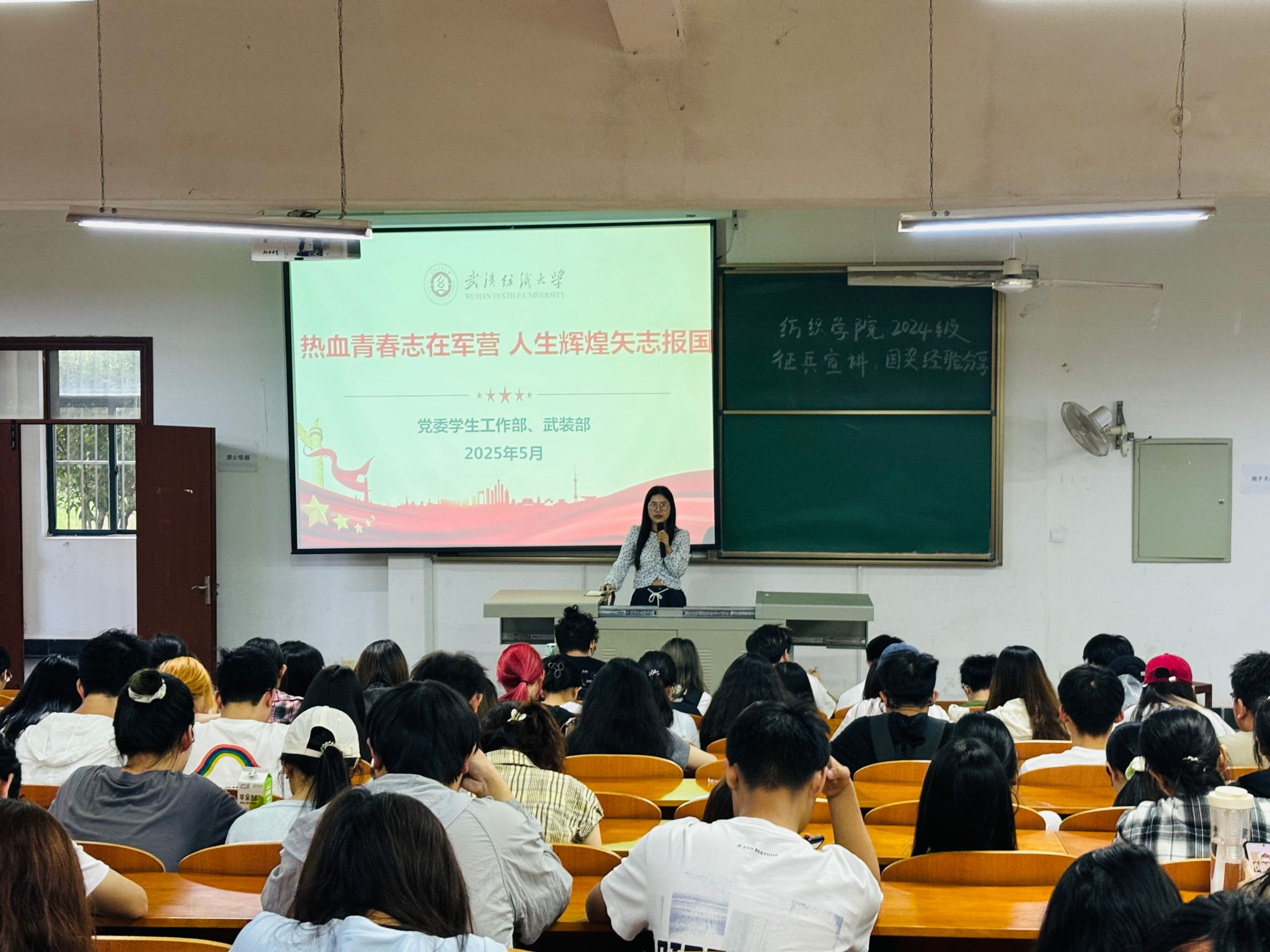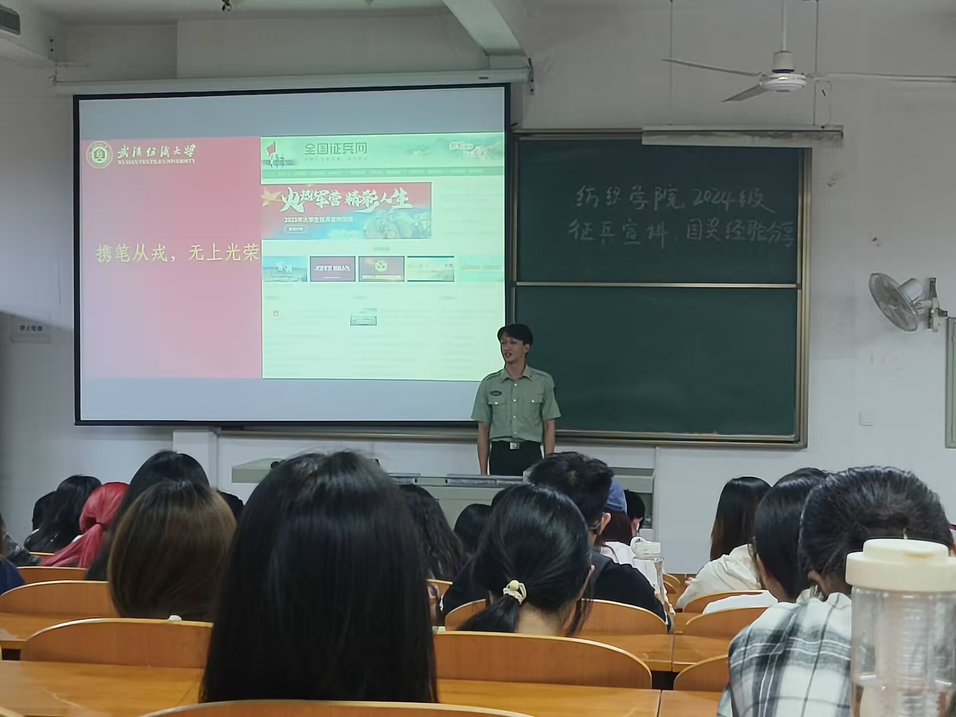 逐梦军旅,砥砺青春。纺织工程12204班退伍大学生郭子扬结合自身入伍经历,生动幽默地讲述了部队生活的点滴,展现了部队对个人意志品质的磨砺和综合素质的提升。其中着重讲解应征入伍的重要意义、服役待遇及发展前景等,鼓励同学们积极响应国家号召,投身军营,将个人理想融入强国强军伟大事业,在绿色军营中实现人生价值。