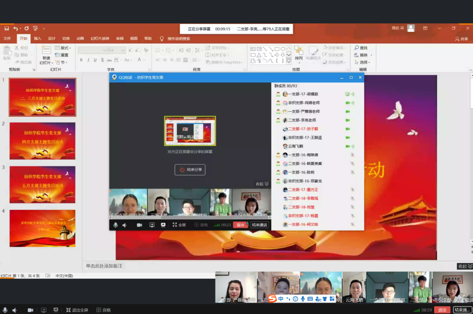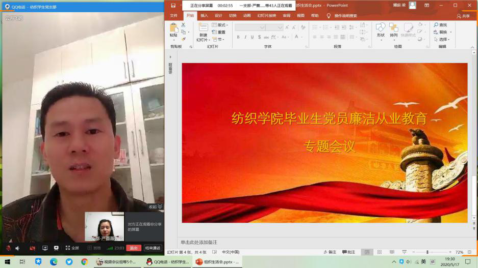 会上,首先纺织学生一支部书记严蔷薇老师为全体毕业生带来《党员组织关系的重要性及注意事项》的微党课,带领大家共同学习了毕业生党员组织关系转接的相关事宜,并强调了党员档案以及党组织关系的重要性。接着,非织学生党支部书记、毕业生辅导员肖娟老师为大家带来《毕业生廉洁从业专题教育》的党课,要求每位毕业生党员在今后自己的工作岗位或学习生涯中继续发挥党员模范带头作用,从严要求自己、廉洁自律。希望大家能坚定崇高的理想信念,发扬党的优良传统,坚持好的党员作风,遵守党规和国法,树立正确的世界观、人生观、价值观,不断增强自身的使命意识、大局意识、奉献意识,做到爱岗敬业、廉洁从政。最后,肖老师提出,在这个特殊的疫情毕业季,希望所有党员们牢记自己的光荣使命,认真履行党员义务,挺身而出站好最后一班岗,以身作则,帮助老师切实做好毕业生文明离校工作,顺利走完美好的大学生活。
