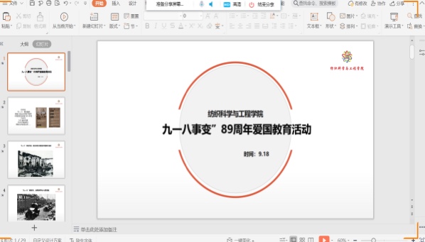 会议伊始,詹克静通过历史文献,利用视频、ppt以讲故事的形式,给大家生动普及了九一八事变的简述、时代背景、影响和关于九一八事变的知识问答。通过影片回顾震惊中外的“九一八”事变, 让同学们感受日本侵略军的贪婪野心。一桩桩往事无不牵动着大家的心,使之深刻体会肩负在大学生身上的责任感和使命感。视频资料还原了历史,介绍了“九一八”事变的经过和日本军队对我们中国的践踏和惨无人道的侵略,带领着全体学生回顾了那段屈辱的国耻,并展现了中国人民团结奋战,最终夺取抗日战争胜利的艰难历程,使学生们感受到幸福生活的来之不易。使同学们明白了九一八事变的特殊意义,深刻认识到吾辈当自强,为国争风光的重要性。