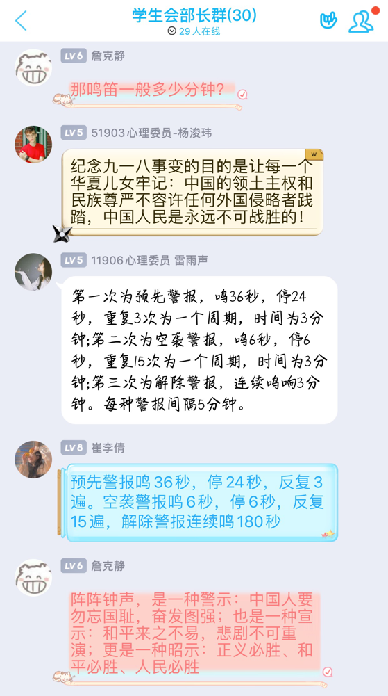 李老师表示,此次活动的开展,让同学们对九一八事变有了更加清晰的了解和深刻的印象。每年的这一天,防空警报都会划破宁静的长空,提醒着我们,中华民族曾经历了怎样的苦难,中国人民曾经过怎样艰苦卓绝的斗争,落后就要挨打,和平来之不易。牢记“九一八”,让警钟长鸣心中,是对历史最好的纪念,也是最深的敬畏。历史是最好的教科书也是最好的清醒剂“九一八”不敢忘,不会忘,不能忘!作为新时代的中国青年,应该抱着浓厚的爱国情怀,坚定自己的立场,为实现习近平总书记所说的‘中国梦’而努力奋斗!