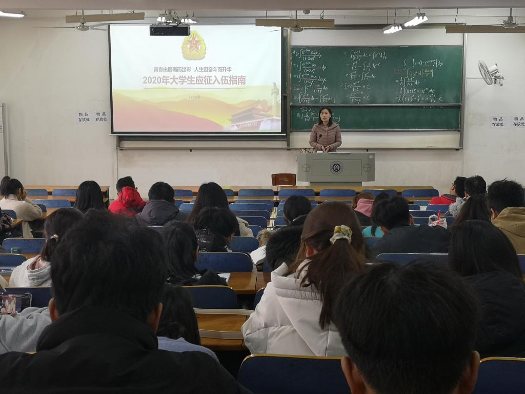 吴童玲老师从部队简介、应征入伍基本条件、大学生参军的优惠流程等方面给大家进行了全面细致的讲解,加深了大家对从军生活的了解和向往,激发了同学们从军报国的热情。