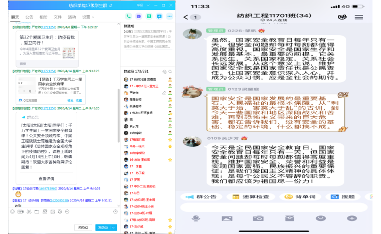 辅导员严蔷薇老师首先和17级同学们观看了中国工程院院士范维澄的《总体国家安全观视角下的疫情防控》在线课程,然后介绍了国家安全法律规定的政治安全、国土安全、军事安全、经济安全等11个领域的相关知识,最后大家就新时代大学生在国家安全方面担负的使命与任务进行了热烈的讨论。通过本次主题班会,学生们充分了解到当今国家安全面临的严峻形势,认识到国家安全对于大学生角色的重要性,充分提升了国家安全意识。