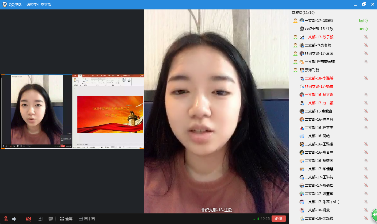 党委陈海副书记、三位本科生支部书记以及全体学生党员参与了本次云上会议,会议由纺织学生一支部书记严蔷薇老师主持。