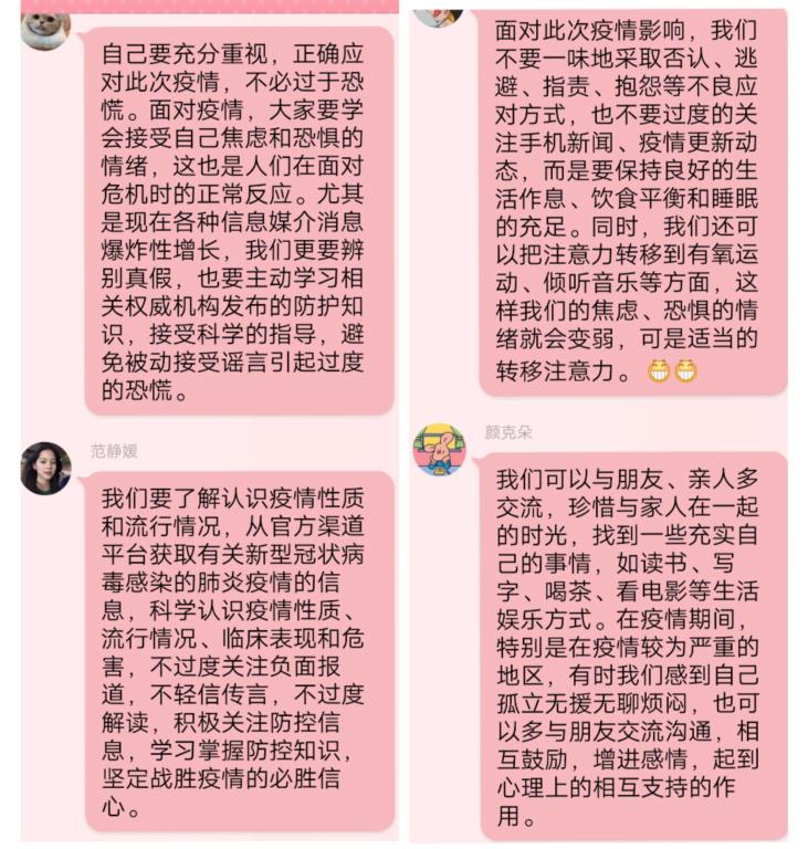 此次班会由各班心理委员引导大家观看疫情防控视频,分享疫情期间发生的动人的故事,同时对于大家在疫情期间可能产生的心理问题进行疏导。