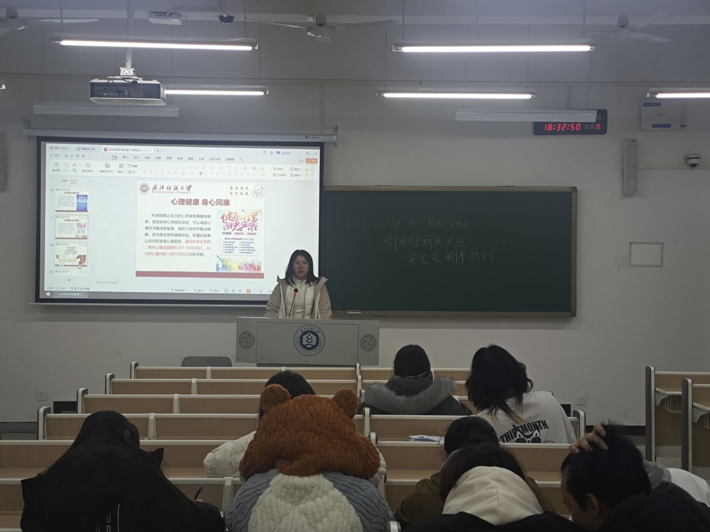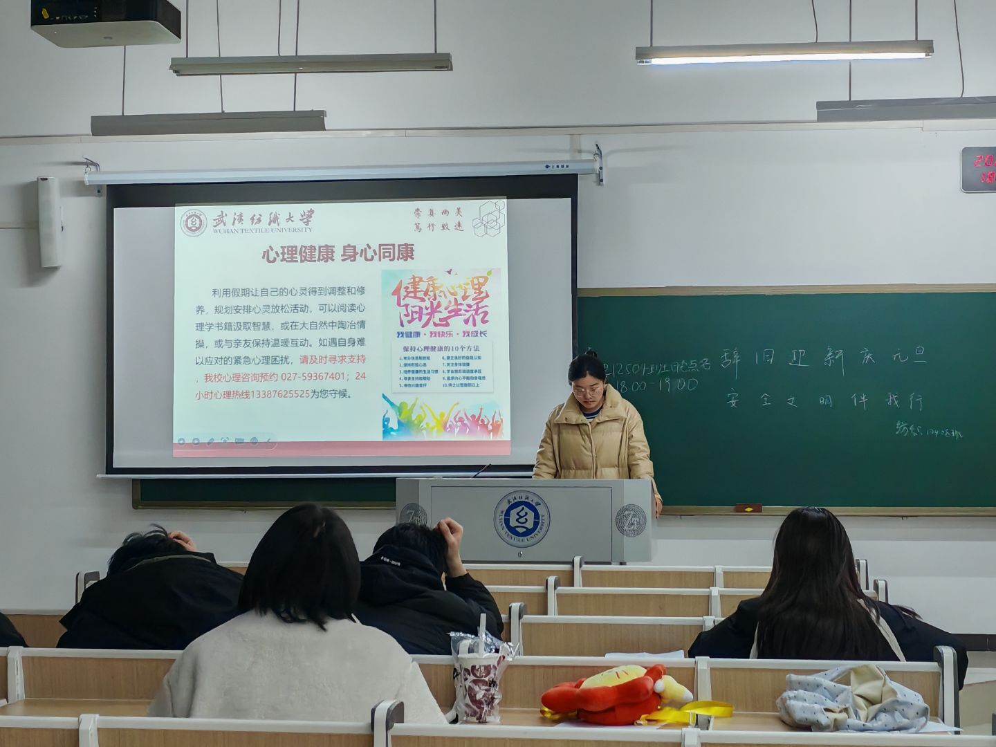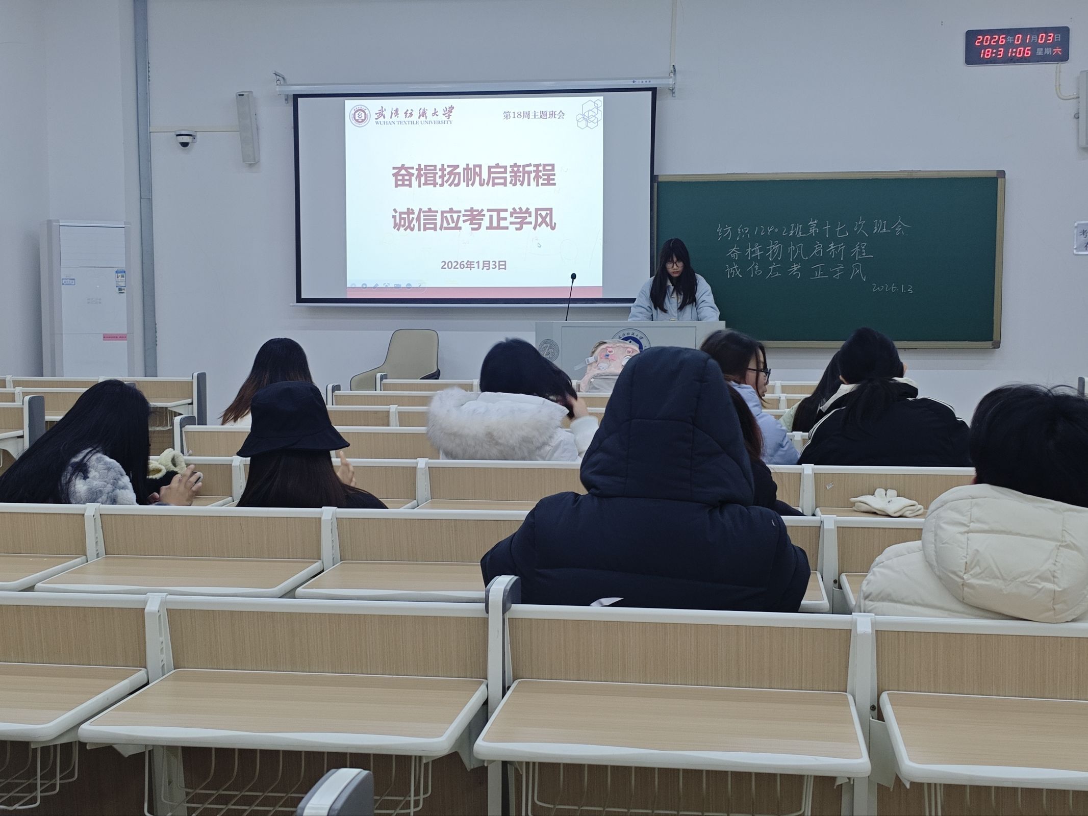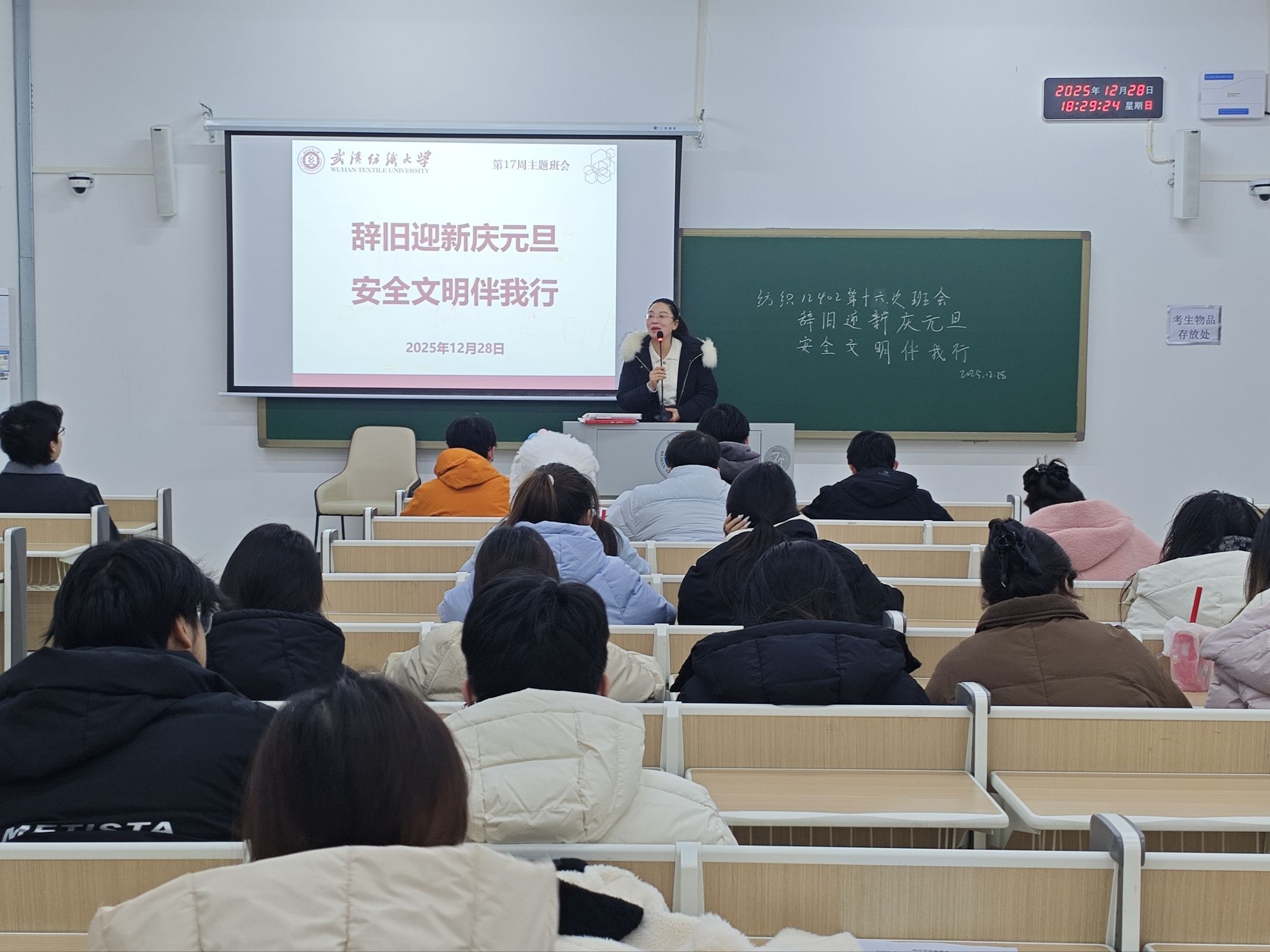 班会上,班主任、辅导员老师系统梳理了元旦节日的历史由来、阐释其文化内涵,引导学生理性看到“洋节”和传统节日。老师们还聚焦“安全防护”与“文明过节”两大重点,紧密结合大学生生活场景开展针对性引导,在“安全护航元旦”专题板块,重点围绕假期安全、校园安全、网络安全三大维度进行全面细致的强调部署,为全体同学度过平安祥和的元旦假期筑牢基础。