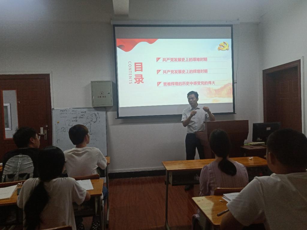 课上,陈海带领大家一起回顾了中国共产党的奋斗史,介绍了我们共产党发展史上的艰难和辉煌的重要时期,让大家在苦难辉煌的历史中感受党的伟大。还和同学们一起回顾了党史上的三件重大事件,感悟党带领人民完成新民主主义革命,社会主义革命以及改革开放的伟大胜利。随后,还总结了我党由弱变强,由小变大的重要历史经验,强调了我们党注重在思想上建党,注重培养和实用人才,注重党风廉政建设,注重保持蓬勃生机和活力的优良传统。引导同学们加强“四个自信”,做到“两个维护”,相信我党在新的百年起点,将会带领我们国家和人民走向更加辉煌的未来,同学们要强化学习,强化本领,努力奋斗,为国家、人民作出更大贡献!