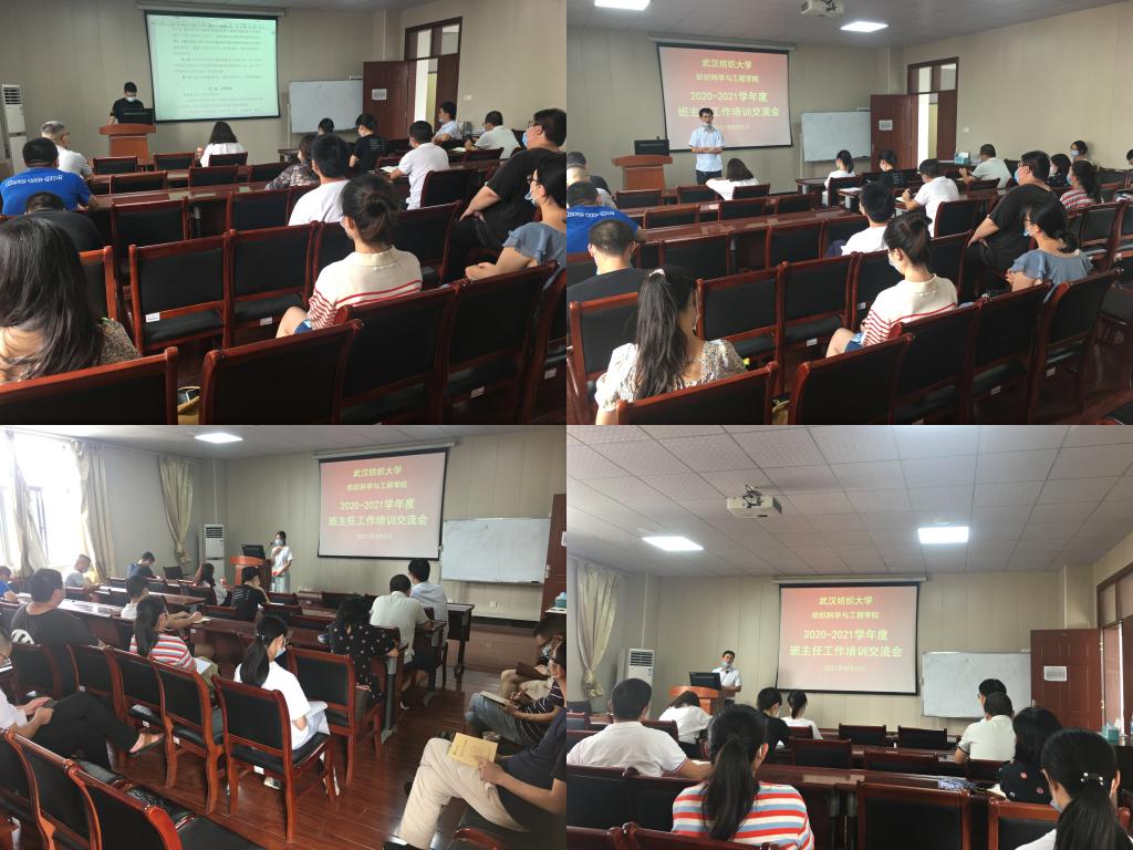 班主任长期以来在学生培养过程的辛勤付出表示了肯定和感谢。会上,李亮老师带领全体老师一起学习了《武汉纺织大学本科生班主任管理办法》,并对其中的相关政策进行详细解读;新老班主任也在大会上进行了经验交流与分享:黎征帆老师作为优秀班主任分享了班主任工作心得,他提出作为班主任就是要以真心换真心,真心实意为学生想、为学生做,会得到学生最大的理解与支持,也能够最大程度的做好班主任工作,作为班主任一要能够筑牢安全防线,紧抓学生身心安全、健康发展;二要能紧盯思想建设,加强班级的凝聚力;三是要能够紧抓学风建设,开展专业引领,引导学生深耕纺织;四是要积极指导学生开展课外科技实践锻炼,五是凝聚工作合力,主动与辅导员、副班主任多沟通、多交流。新生班主任曾贝妮老师则结合自己即将带领的2021级新生实际情况,交流了对未来新生班主任工作的想法,提出要和新生想在一起、学在一起、苦在一起、乐在一起,与新生共成长。随后。陈海根据根据新修订的《武汉纺织大学本科生班主任管理办法》对新学期的班主任工作提出了相关要求:一是要深入关注学生思想,作为班主任要多跟学生接触,细致了解学生特点,了解学生思想和行为动态。二是积极培养优良班风,培养学生集体荣誉感,提高道德评价能力,知行统一;三是加强学生干部队伍建设,充分发挥班干部和副班主任在班级管理中的核心作用,有声有色凝心聚力做好班级工作;四是关心关爱学生,保护学生安全,关心学生健康,维护学生权益。尤其是要关注重点学生。期盼大家都按照学校班主任工作的“五必谈”和“八到位”共同做好新学年的班主任工作,形成育人合力。